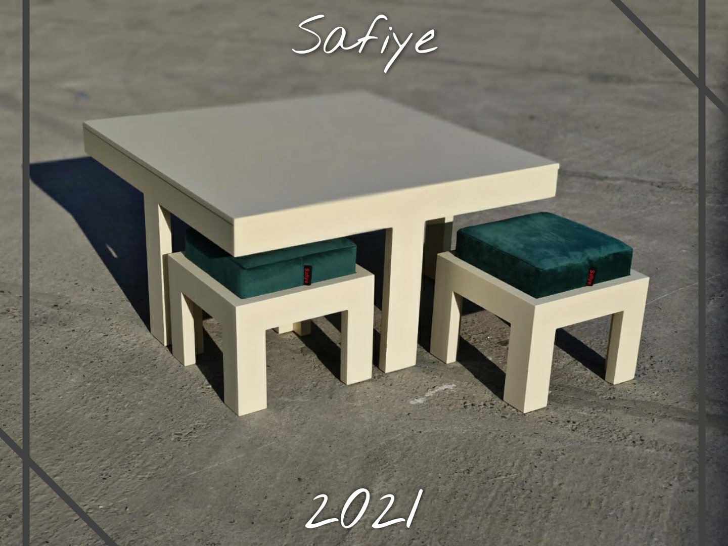 📏Ölçüləri: masa(100*100), pufiklər(40*50)