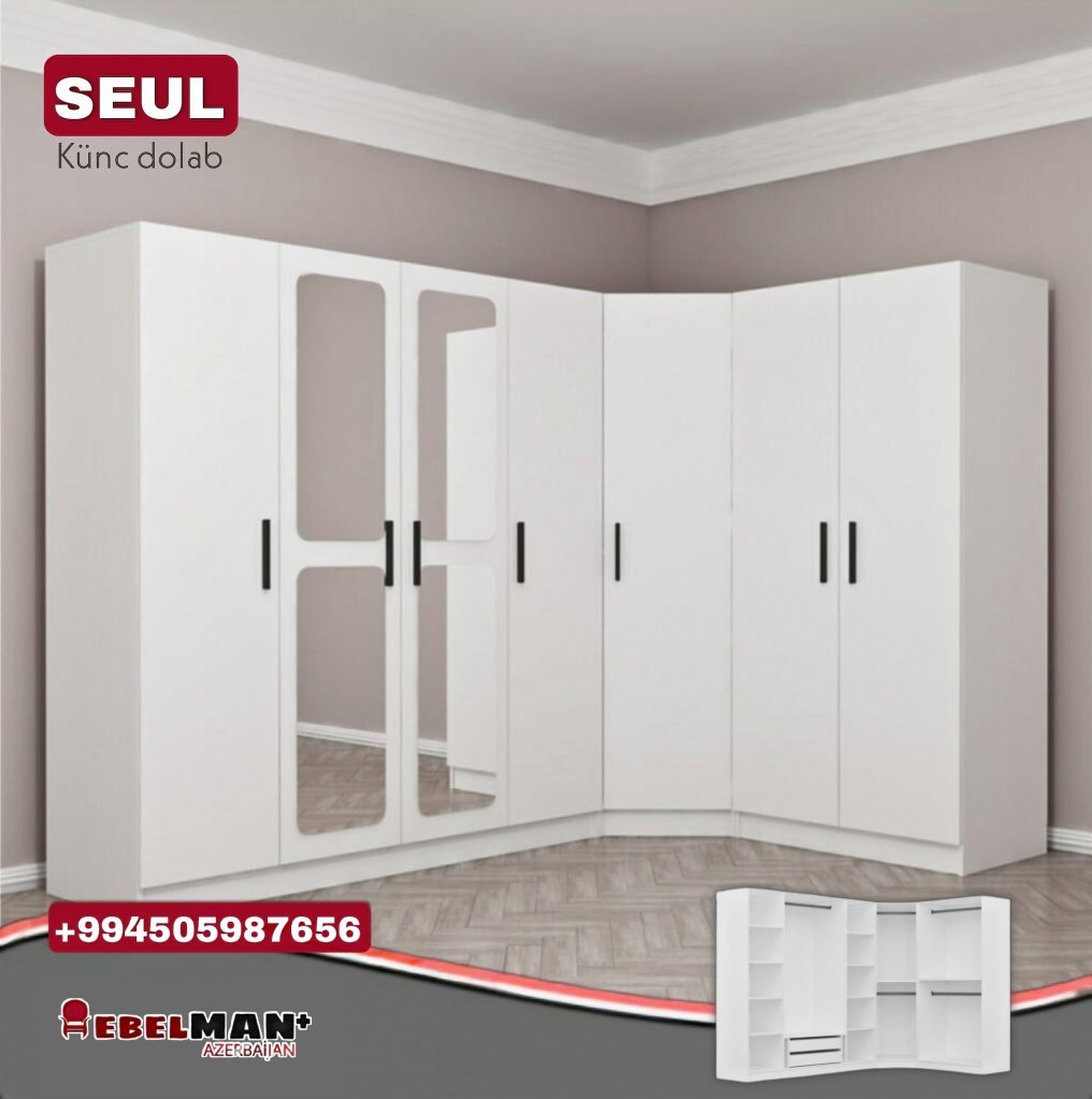 SEUL künc dolab komplekti. 3 dolabdan ibarət bu dəst sifarişlə İstənilən ölçüdə hazırlanır. İstehsalında qalın Rusiya lamınatından(18 sm) istifadə olunan bu mebel dəstini çox münasib qiymətə, çatdırılma və quraşdırılma pulsuz əldə edə bilərsiz.