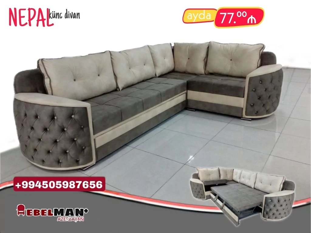 Modern üslubda, rahat və geniş künc divanı sizlərə təqdim edirik. Böyük balışlarla hədiyyəli NEPAL künc divanını həm nəğd, həm də kreditlə əldə edə bilərsiz.