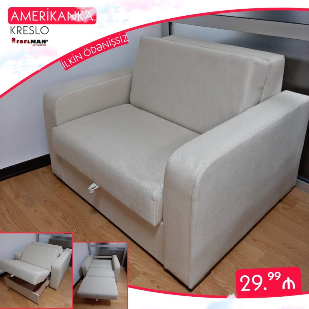 Çarpayı özəlliyi olan, amerikanka mexanizmli AMERİKANKA kreslo ilə evinizin gözəlliyinə gözəllik qatın. Funksionallığı ilə səmərəli mebeldir elə deyilmi?! Açılıb çarpayı olan və bazalı divan amerikanka stildə SAMARA məhsuluna ilkin ödənişsiz kreditlə ayda 29.⁹⁹₼ ödəməklə sahib ola bilərsiniz.