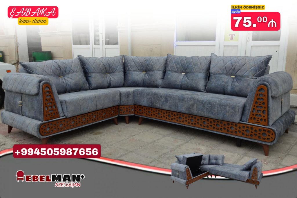 Əla fürsəti qaçırmayın! Yeni model künc divan ŞƏBƏKƏ model endirimli və ilkin ödənişsiz Kreditlə ayda əmi 75₼. Füsünkar gözəllik xüsusi taxta dekorla daha üst pilləyə qalxır. İstehsalında möhkəm və qalın Rusiya istehsalı olan süngərdən istifadə olunub, eyni zamanda üzlük parçası Türkiyə istehsalıdır. Möhkəm karkasa malik olan bu künc divanı keyfiyyətinə Zəmanət verilən dayanıqlı mexanimlərlə təchiz olunub. Rahat açılıb bağlanır.