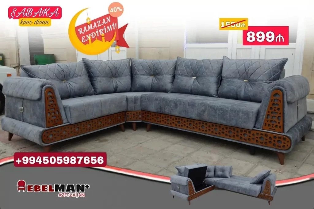SUPER Bayram fürsətini qaçırmayın! Yeni model ŞƏBƏKƏ künc divan modeli nə az nə çox düz 40% endirimlə. 1500₼ yox cəmi 899₼. Füsünkar gözəllik xüsusi tikiliş və taxta dekorla daha üst pilləyə qalxır. İstehsalında möhkəm və qalın Rusiya istehsalı olan süngərdən istifadə olunub, eyni zamanda üzlük parçası Türkiyə istehsalıdır. Möhkəm karkasa malik olan bu künc divanı keyfiyyətinə Zəmanət verilən dayanıqlı mexanizmlərlə təchiz olunub. Rahat açılıb bağlanır.