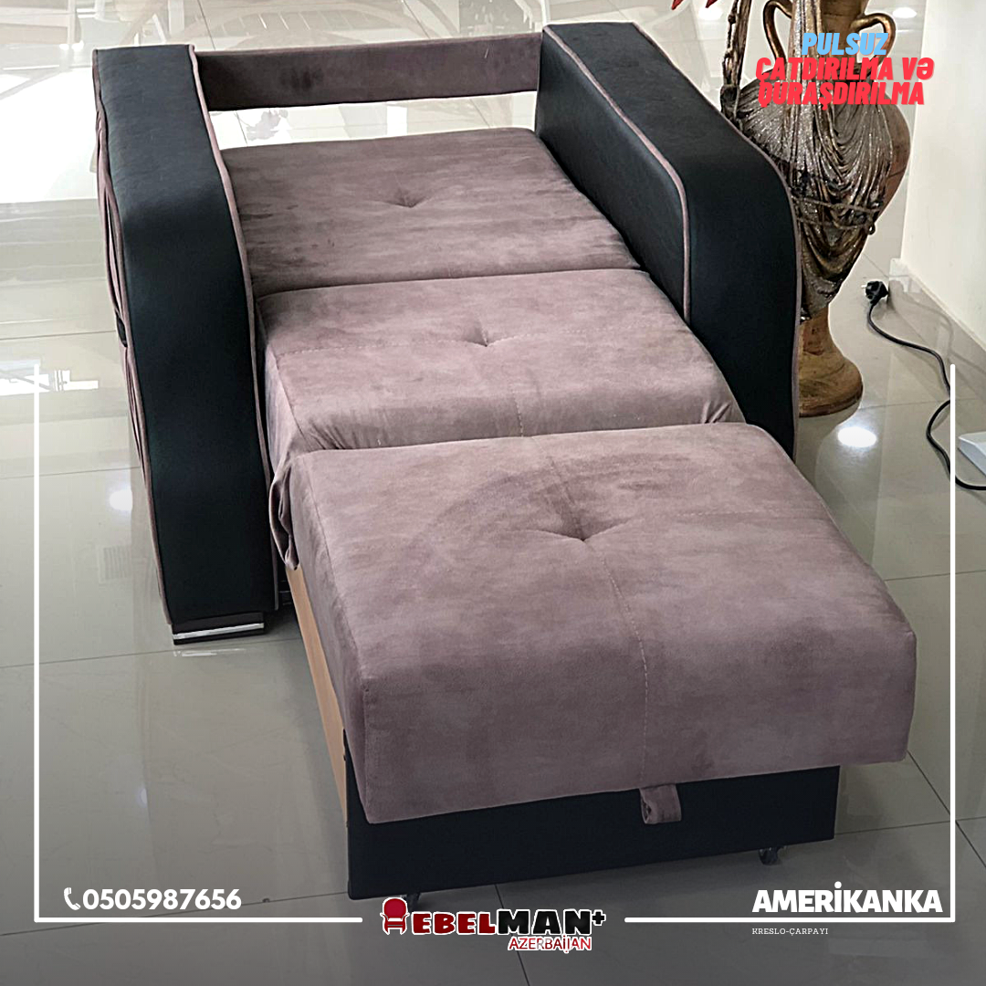 Çarpayı özəlliyi olan, amerikanka mexanizmli AMERİKANKA kreslo ilə evinizin gözəlliyinə gözəllik qatın. Funksionallığı ilə səmərəli mebeldir elə deyilmi?! Açılıb çarpayı olan və bazalı kreslo Amerikanka indi cəmi 450₼
