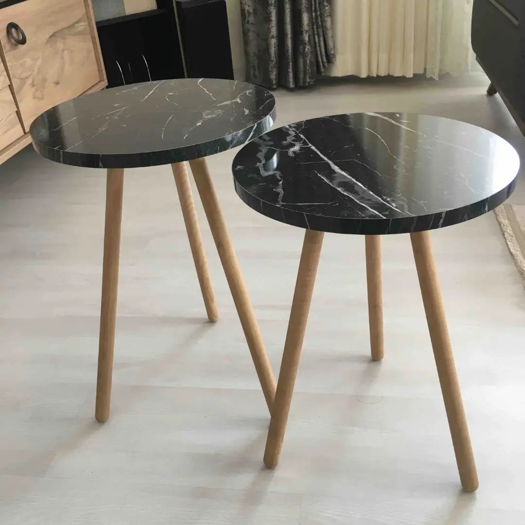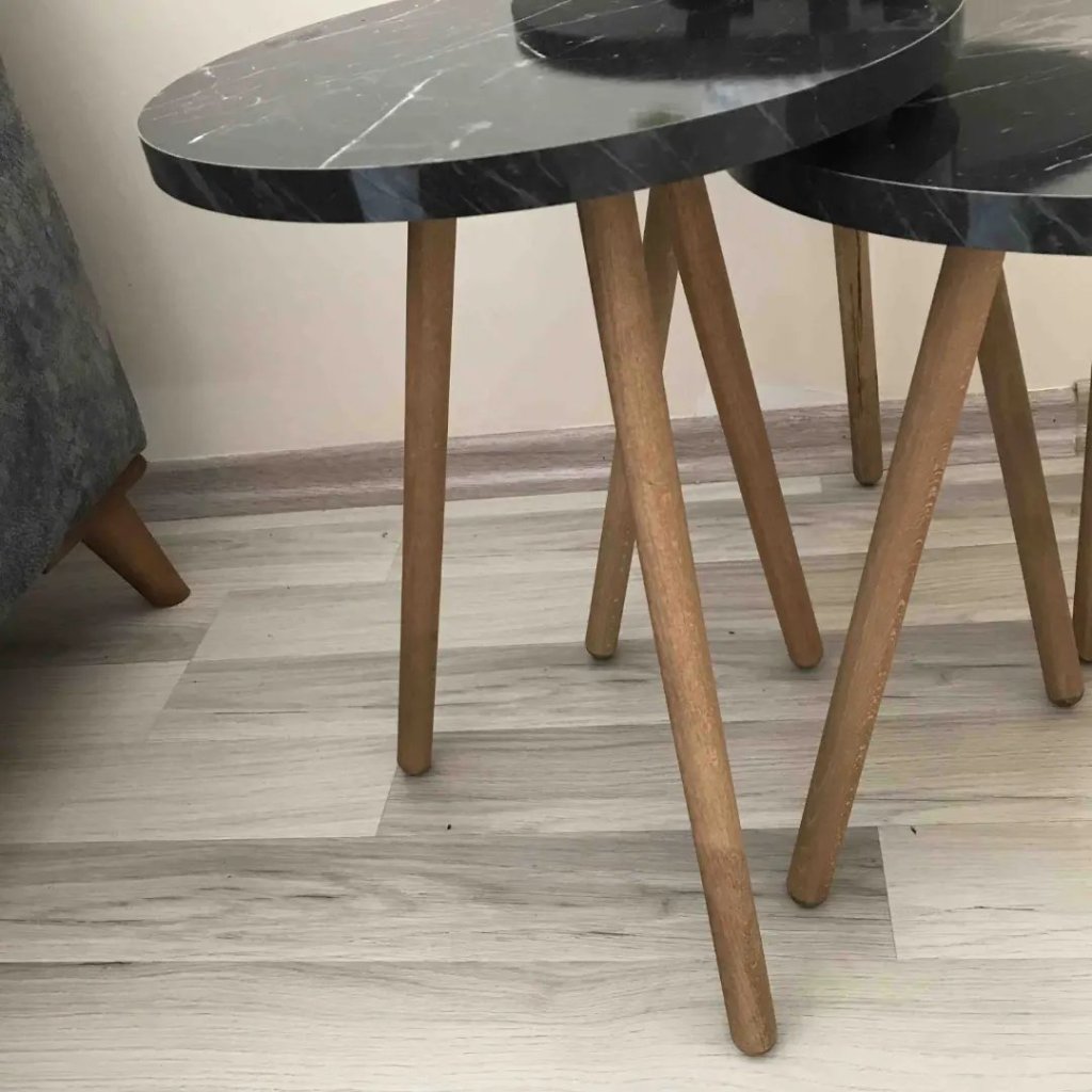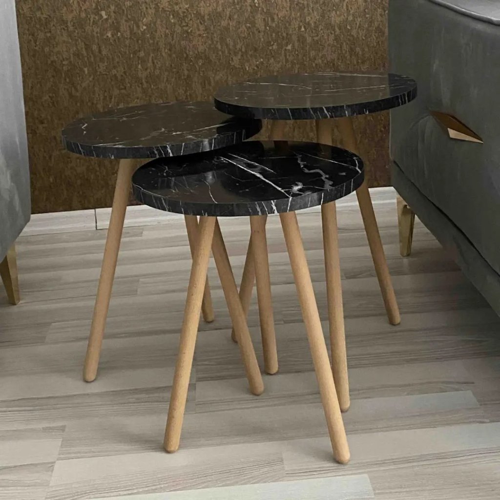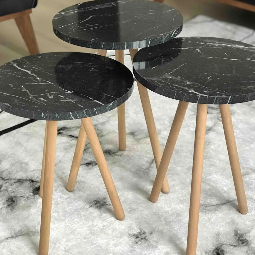 Üçlü Xüsusi dizaynda hazırlanmış 3 Yuvarlaq Masa dəsti qara mərmər rəngdə.
