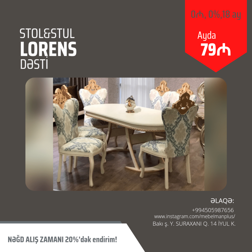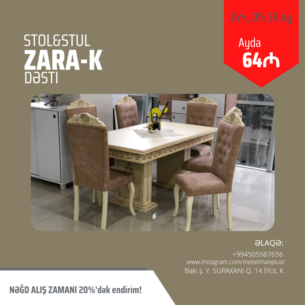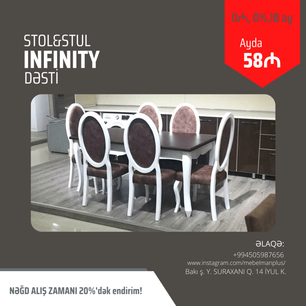 Sizin üçün əla fürsət. 📢 Masa və oturacaq dəstləri ilkin ödənişsiz faizsiz tək şəxsiyyət vəsiqəsi ilə 18 ayadək kreditlə. Ayda cəmi 39₼dan başlayan qiymətlərlə.