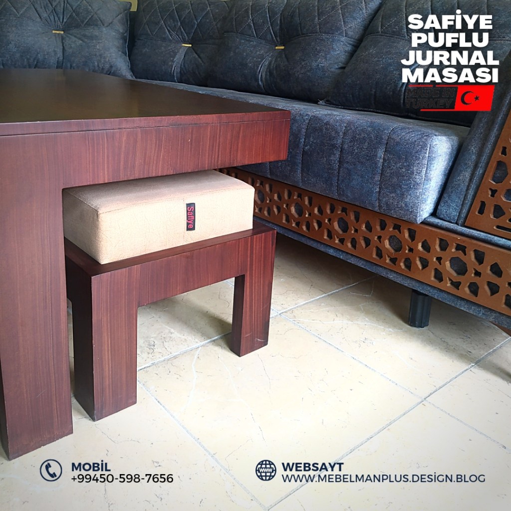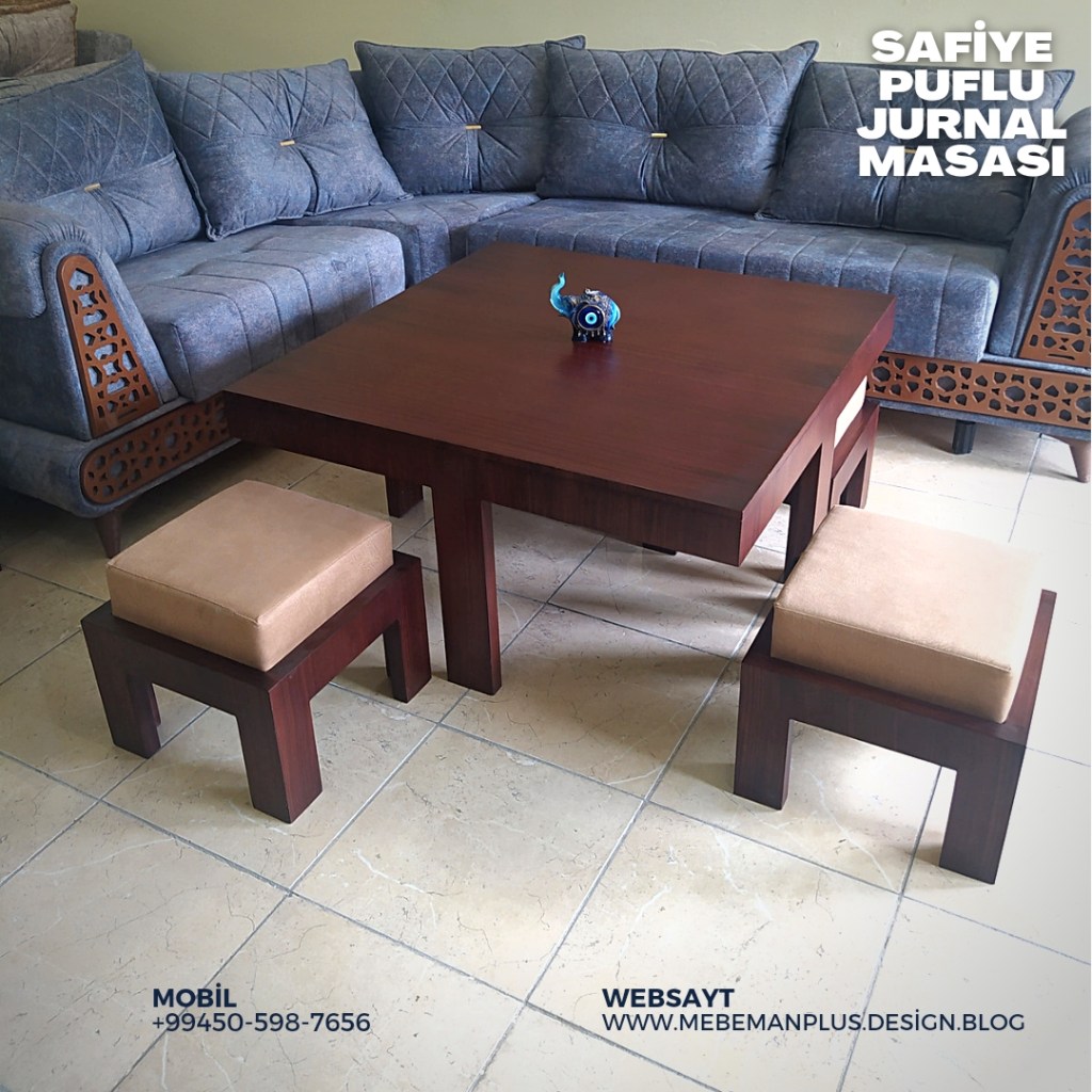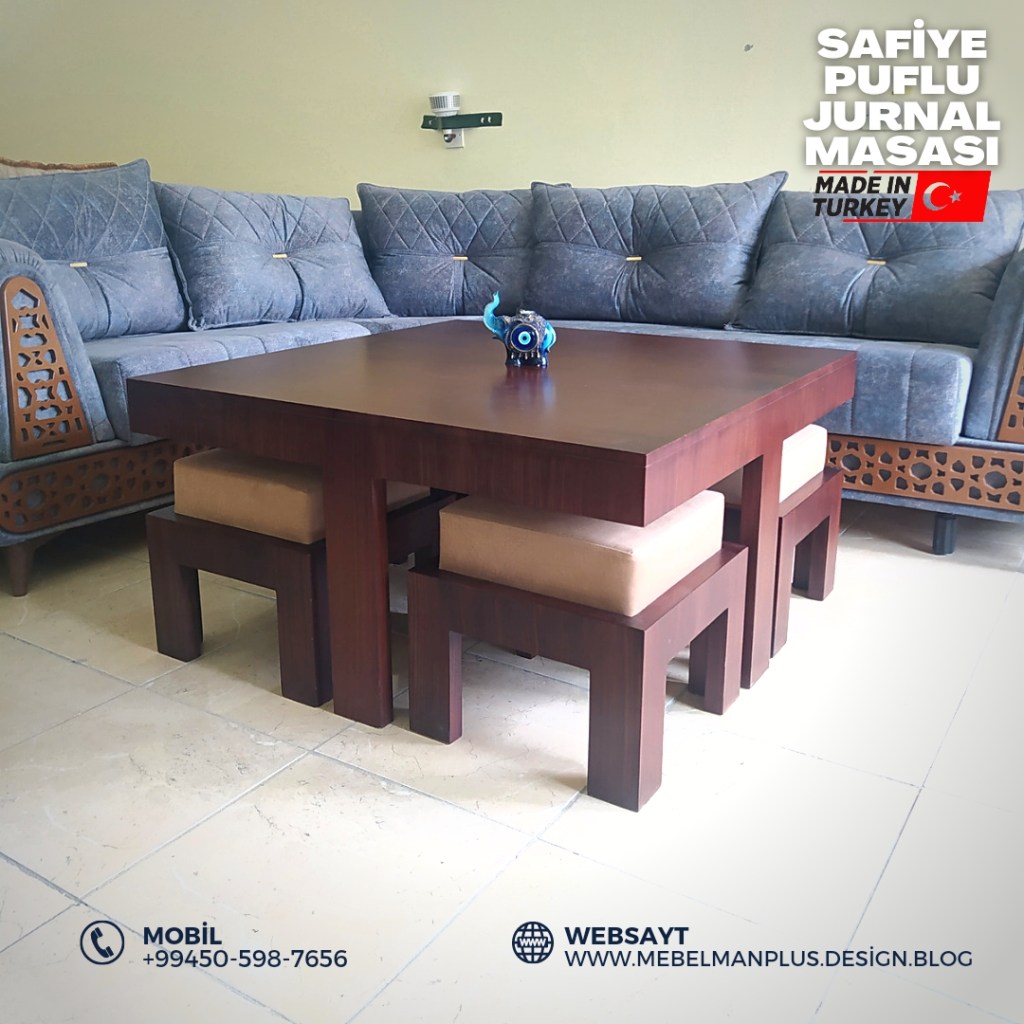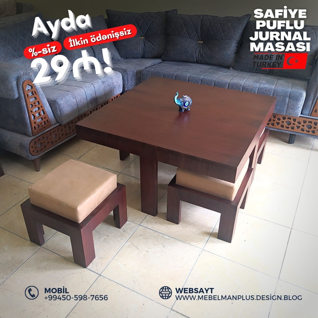 Türkiyə istehsalı “Safiye” puflu masa və oturacaq dəsti ilkin ödənişsiz ayda cəmi 29₼. İstər jurnal masası kimi, istər yemək masası kimi istifadə edə bilərsiz. 4 ədəd oturacaq pufa malik olan bu mebel dəstini indi ilkin ödənişsiz, faizsiz və komissiyasız kreditlə də əldə edə bilərsiniz.