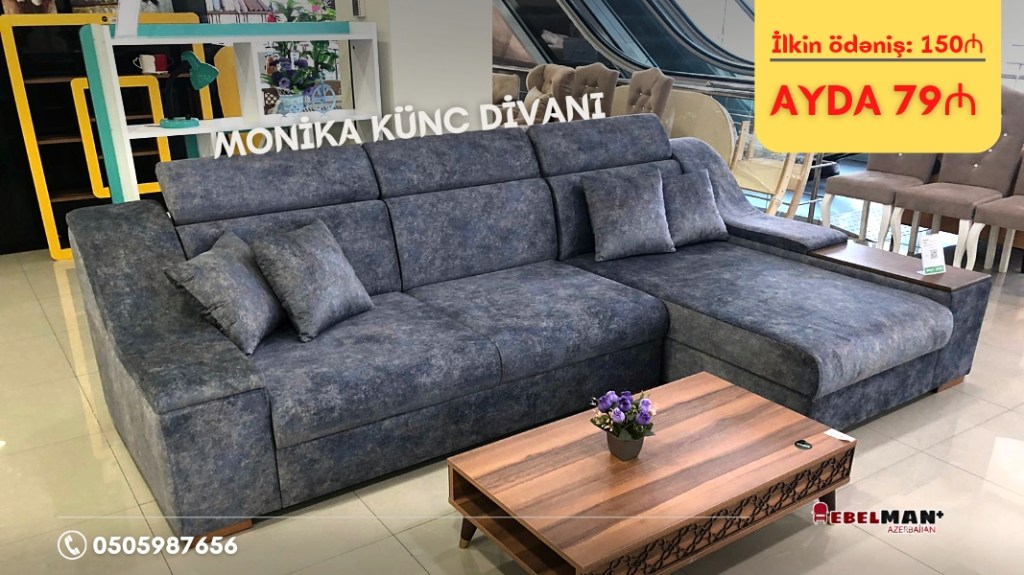 Əla fürsəti qaçırmayın! Yeni model MONİKA künc divan model endirimli və faizsiz kreditlə. Bu ecazkar künc divanı ilkin ödəniş 150₼ ödəməklə ayda cəmi 79₼a əldə edə bilərsiniz. Füsünkar gözəllik xüsusi taxta dekorla daha üst pilləyə qalxır. İstehsalında möhkəm və qalın Rusiya istehsalı olan süngərdən istifadə olunub, eyni zamanda üzlük parçası Türkiyə istehsalıdır. Möhkəm karkasa malik olan bu künc divanı keyfiyyətinə Zəmanət verilən dayanıqlı konfiqurasiya ilə təchiz olunub. Modern mebel seriyasından.