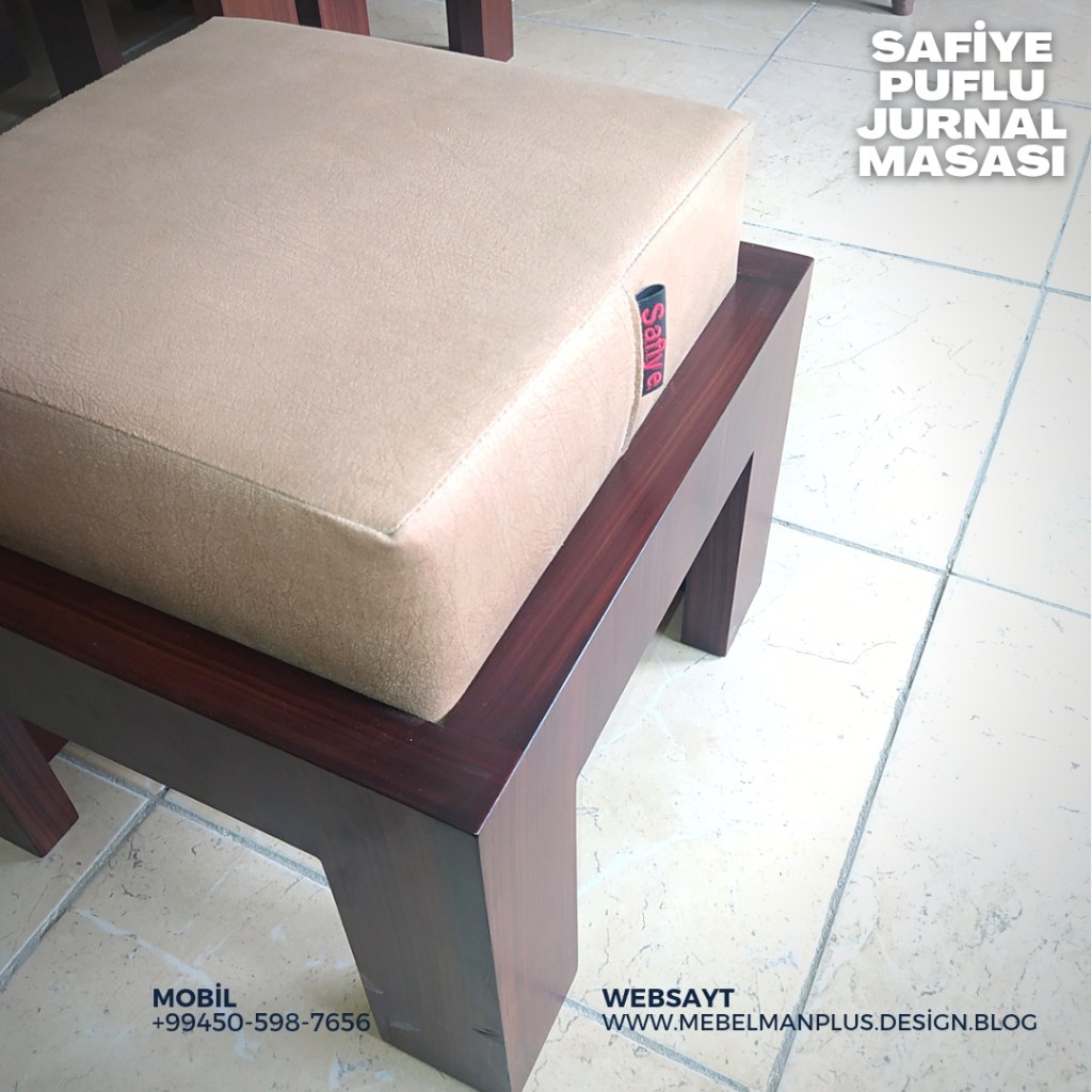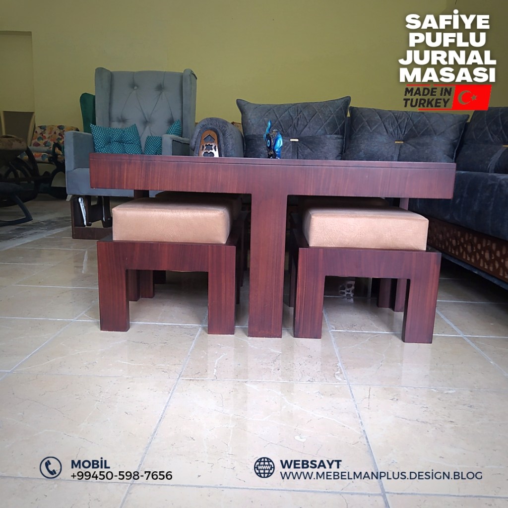 Jurnal masası möhkəm və davamlı MDF materialdan istehsal olunub. Puf Oturacaqların sayı 4 ədəd olmaqla jurnal masasının içərisinə yuvaya yerləşən dizaynda ölçülənib. Puflür yumşaq süngərdən , o cümlədən qalın və rahat təmizlənən bilən Türkiyə istehsalı parça ilə örtülüb.