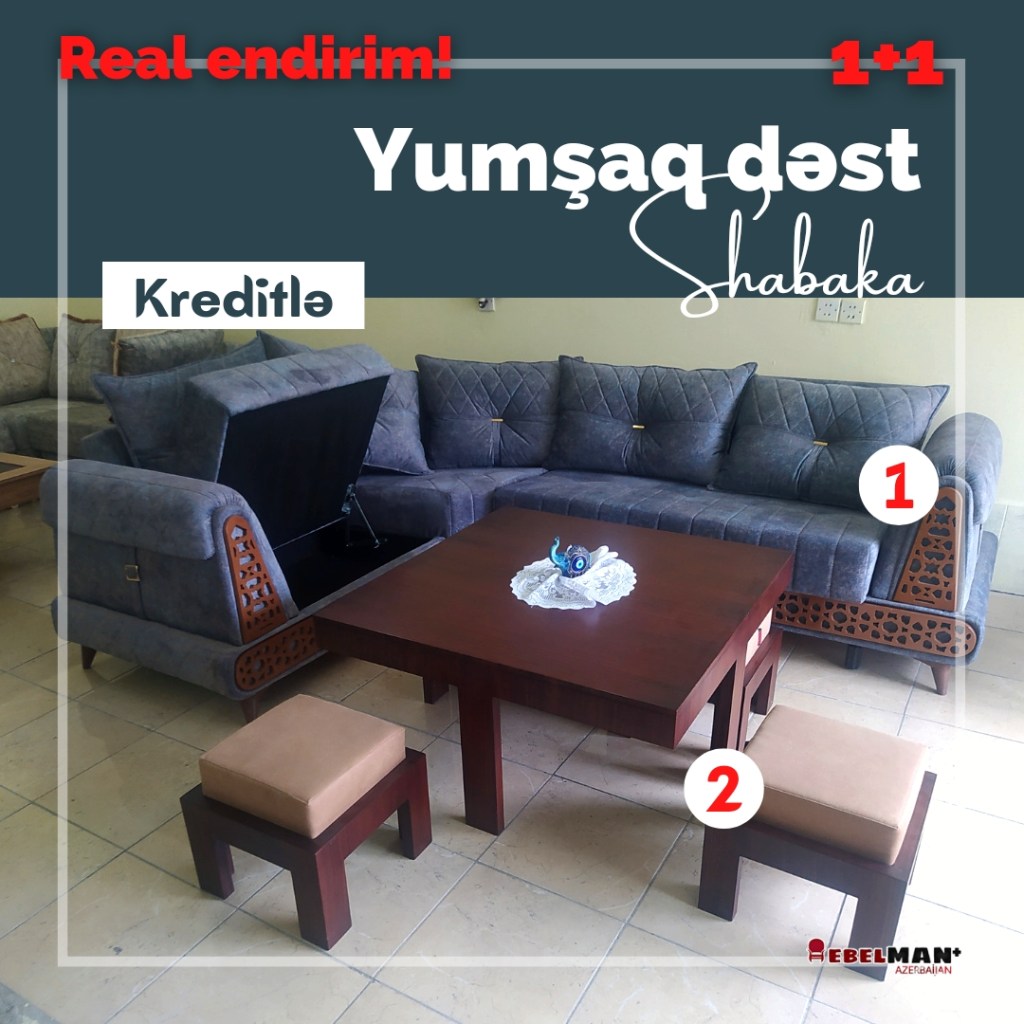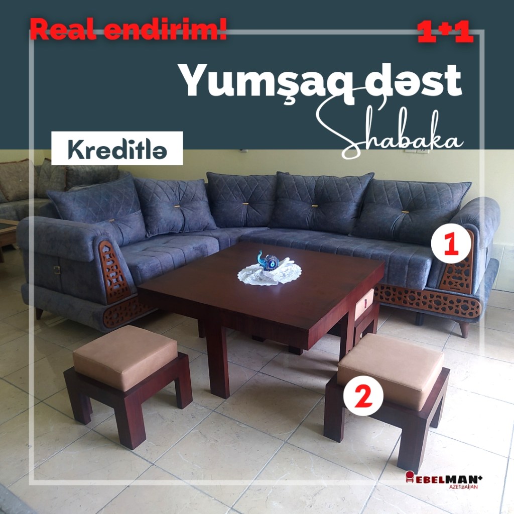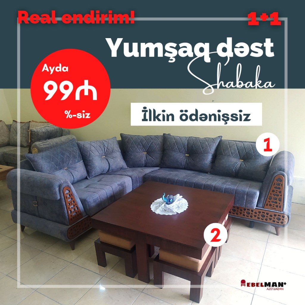 Əla fürsəti qaçırmayın! 2 məhsul 1 arada! Künc divan ŞƏBƏKƏ və 4 ədəd oturacaq pufu olan böyük SAFİYE jurnal masası ilkin ödənişsiz və faizsiz 18 ayadək kreditlə. Bu iki məhsula birlikdə ayda 110 yox cəmi 99₼ ödəməklə sahib ola bilərsiniz. Oxşar dizaynları ilə bir birini tamamlayan bu dəstin son məhsulunu əldə etmək üçün tələsəin! Mağaza qiymətlərinə son, birbaşa istehsalçı qiyməti ilə sizlərə təqdim edirik.