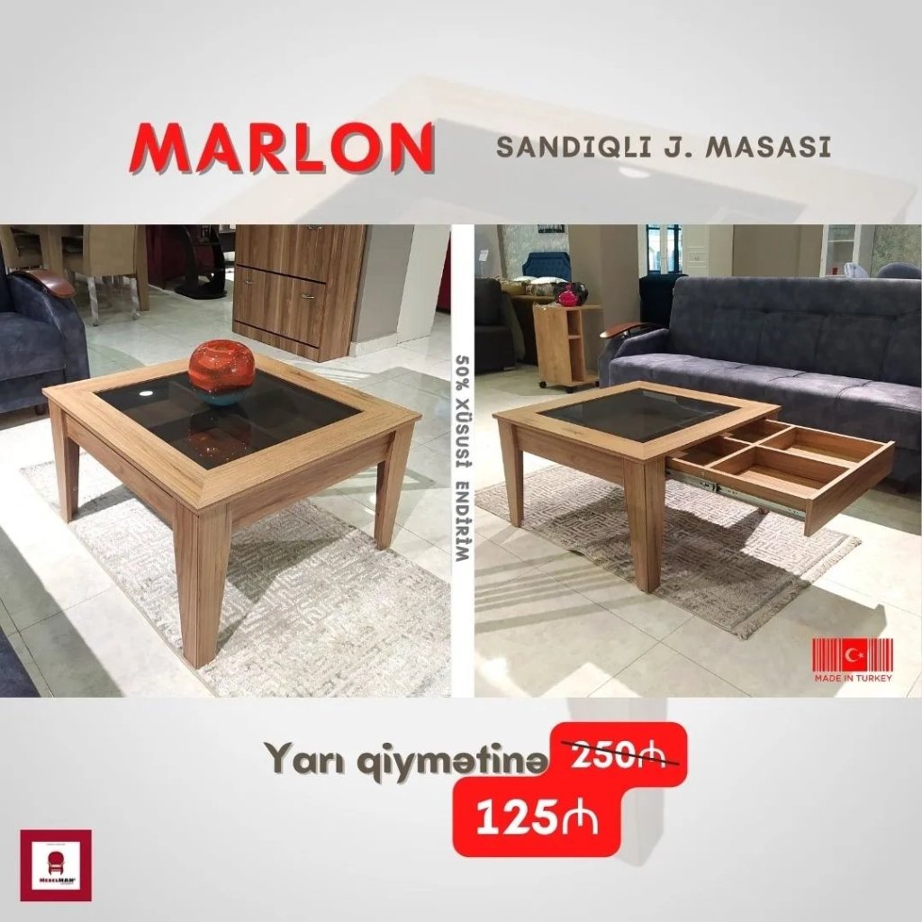 Yeni məhsul MARLON siyirmə bazalı jurnal masası 50% endirimlə, yarı qiymətinə. Salona füsünkar görünüş və səmərəli vasitə olan MARLON jurnal masası kiçik siyirmə-sandığı və şüşə dekoru ilə fərqlilik bəxş edir.