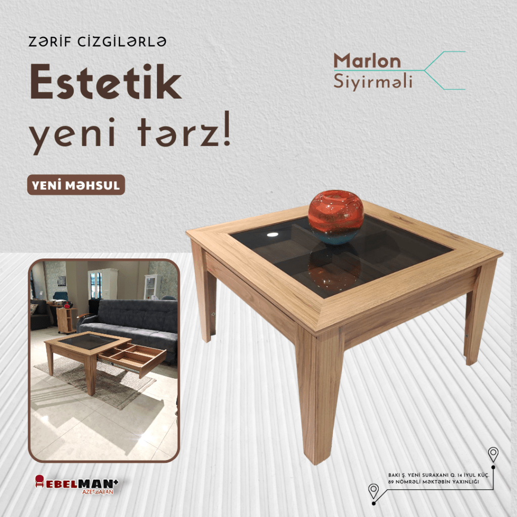 Rəng seçimi açıq ceviz olub, bir çox divan rənginə uyğunlaşır. Kvadrat ölçüdə, parlaq dizaynı ilə və ələlxüsus keyfiyyətli korpusu ilə heç tərəddüd etmədən ala biləcəyiniz mebeldir.