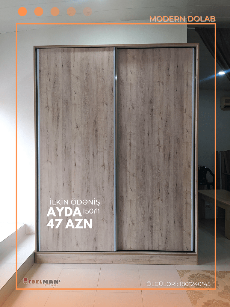 Modern dizaynda, rahat açılıb bağlanan siyirmə qapı mexanizmi ilə təchiz olunmuş MODERN dolab modelimizi kreditlə əldə edə bilərsiniz. İstehsalında Rusiya istehsalı laminat lövhələrdən istifadə edilmiş bu dolab yataq otağı və ya dəhliz üçün əvəzolunmaz seçimdir. Cəmi 150₼ ilkin ödəniş ödəməklə 18 ayadək kreditlə əldə edə bilərsiniz. İstənilən rəng seçimi mövcuddur.