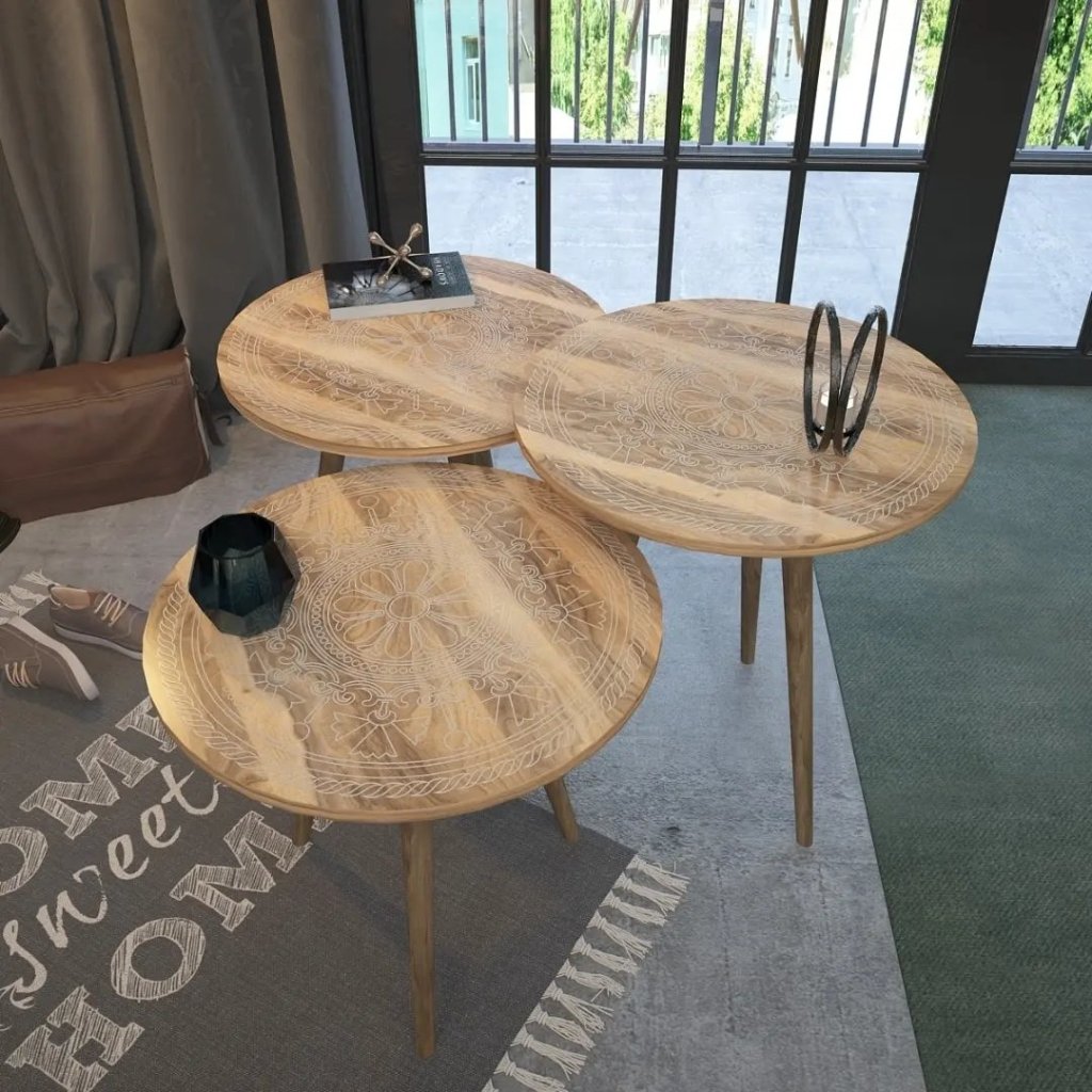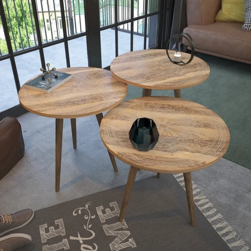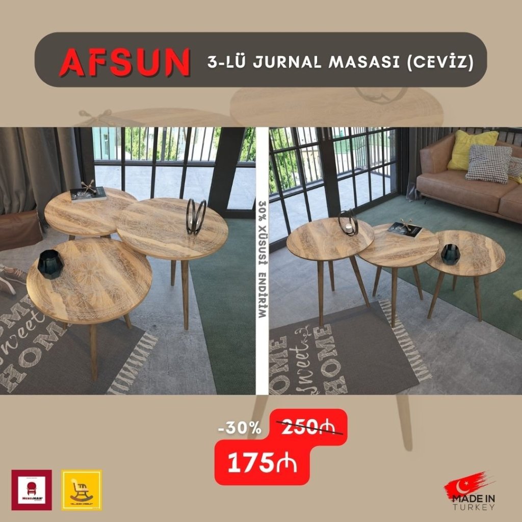 AFSUN 3-lü jurnal masa dəsti 30% xüsusi endirimlə cəmi 175₼. Tam fərqli dizaynda yeni mərhələ. Otağınıza xüsusi gözəllik qatacaq. Üstünü heç bir örtük örtməyə ehtiyac yoxdur, çünki məhsul üstü MDF tərkibli olub, üzəri dekorativ membranla örtülüb.
