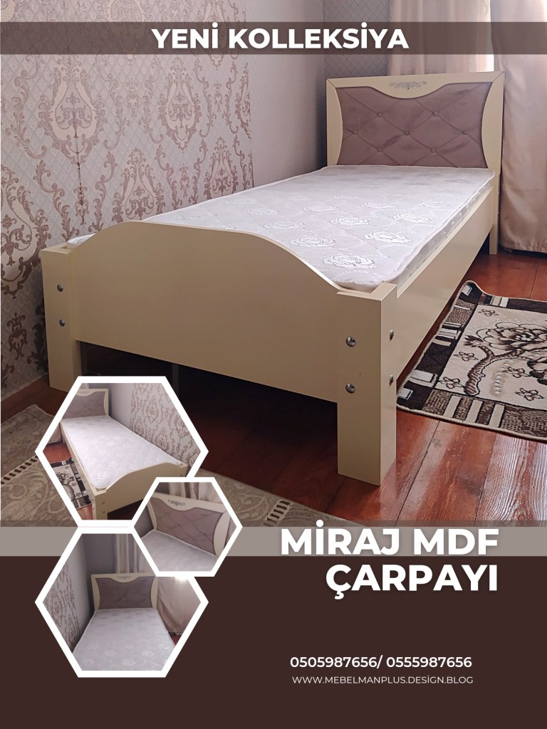 Miraj MDF tək adamlıq çarpayı, adından göründüyü kimi tamamilə MDF korpusa malikdir. Başlıq hissəsi yumuşaq materialla təchiz edilib, ayaq hissələri möhkəm və dayanıqlı bolt-qayka sistemi ilə bağlanıb. İstehsalında Türkiyə istehsalı MDF materialından, o cümlədən başlıq parça növü Türkiyə xammalıdır.
