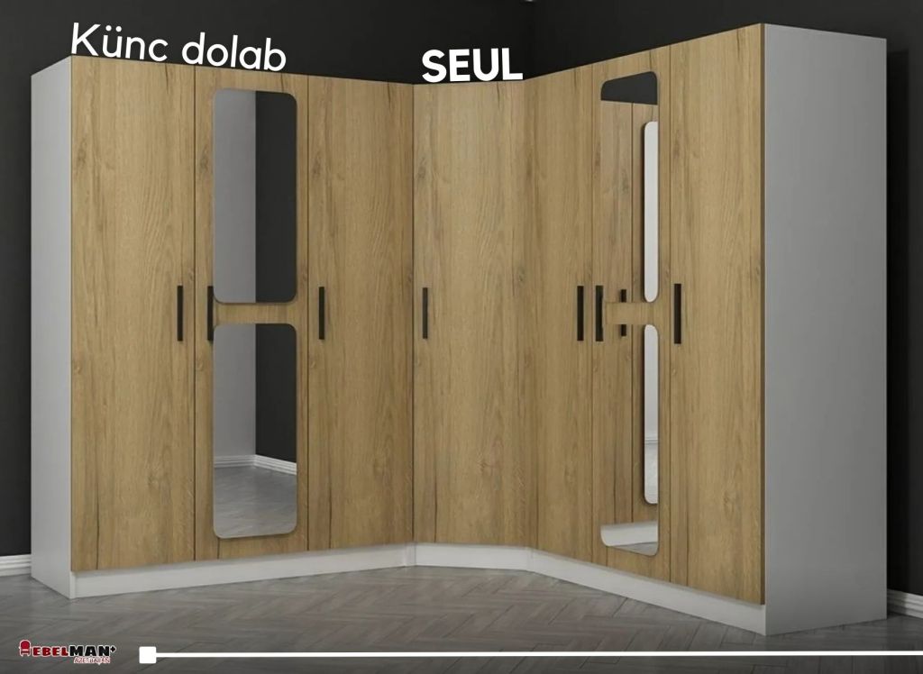 SEUL künc dolab komplekti. 3 dolabdan ibarət 7 qapılı bu dəst sifarişlə İstənilən ölçüdə hazırlanır. İstehsalında qalın Rusiya lamınatından(18 sm) istifadə olunan bu mebel dəstini çox münasib qiymətə, çatdırılma və quraşdırılma pulsuz əldə edə bilərsiz.