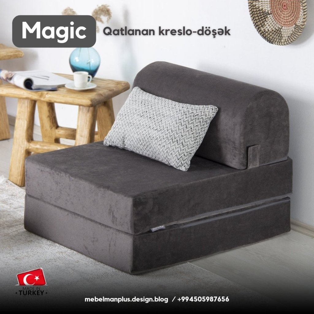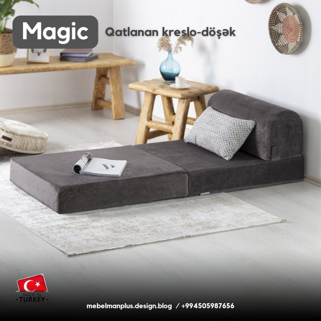 İstədiyiniz zaman divan, istədiyiniz zaman çarpayı ola bilən çox məqsədli istifadəsi sayəsində evinizdə “Yerim yoxdur, qonağım çoxdur” deyənlər üçün praktik həllər təqdim edir.” Magic Katlanan Döşək unikal dizaynı, qalıcı daxili süngəri, fərqli istifadə variantları, yüksək rahatlığı və rəng müxtəlifliyi ilə təqdim edir. Zəncirbəndi (замок) sayəsində asan çıxarılan və yuyula bilən örtük təmin edir. Məxmər parça istifadə edildiyi üçün hər toxunuşda mükəmməl yumşaqlığı hiss edəcəksiniz. Tək və ikili variantları mövcuddur. İstəyirsinizsə, ikisini də alıb, birləşdirib oturma qrupuna çevirə bilərsiniz. Dostlarınızla əyləndiyiniz yerlərdə istifadə etməyinizi arzu edirik.