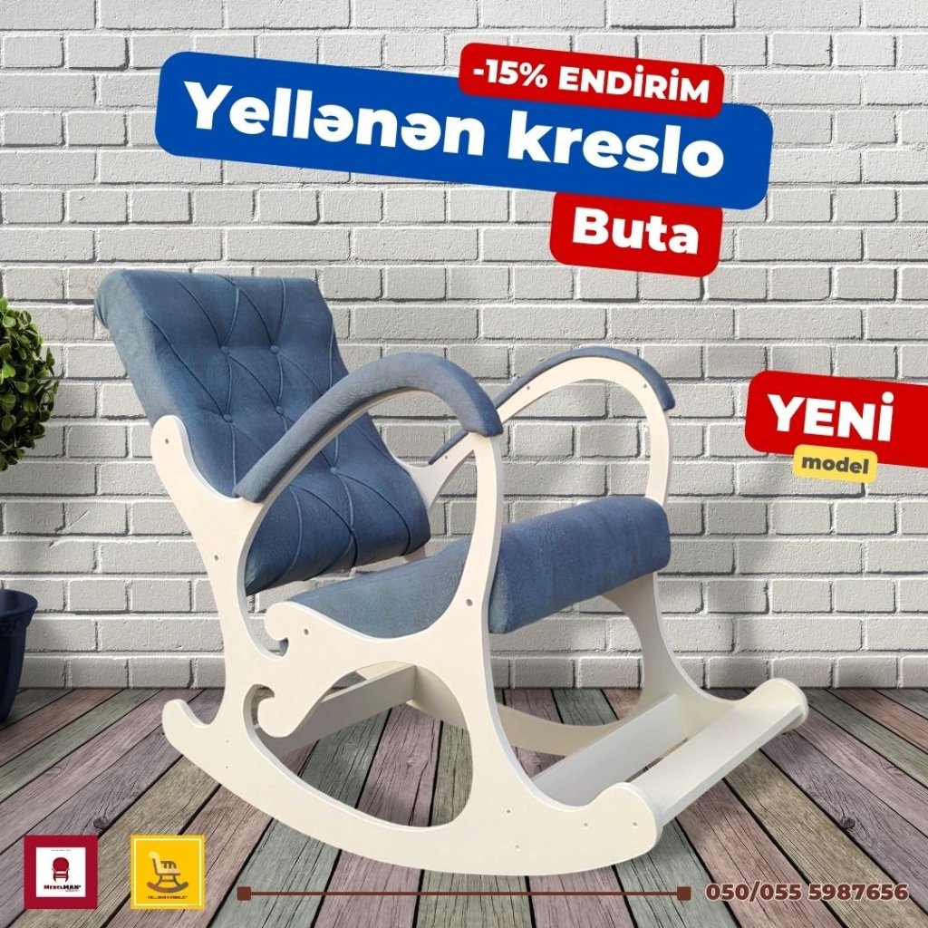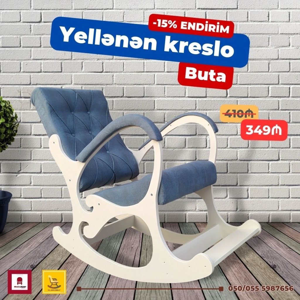 Məhsulumuzda füsünkar gözəllik xüsusi dizaynla daha üst pilləyə qalxır. İstehsalında möhkəm və qalın Rusiya istehsalı olan süngərdən istifadə olunub, eyni zamanda üzlük parçası Türkiyə istehsalıdır. Möhkəm diktdən təchiz edilmiş karkasa malik olan bu yellənən kreslonun oturacağı və söykənəcəyi qalın və möhkəm astarı olan yüzlərlə çeşidə malik parçadan örtülmüşdür. Rəngi ilə səmanı xatırladan BUTA ilə, onun yumşaqlığı və geniş sahəsi ilə özünüzü sanki buludların əhatəsində hiss edəcəksiniz.