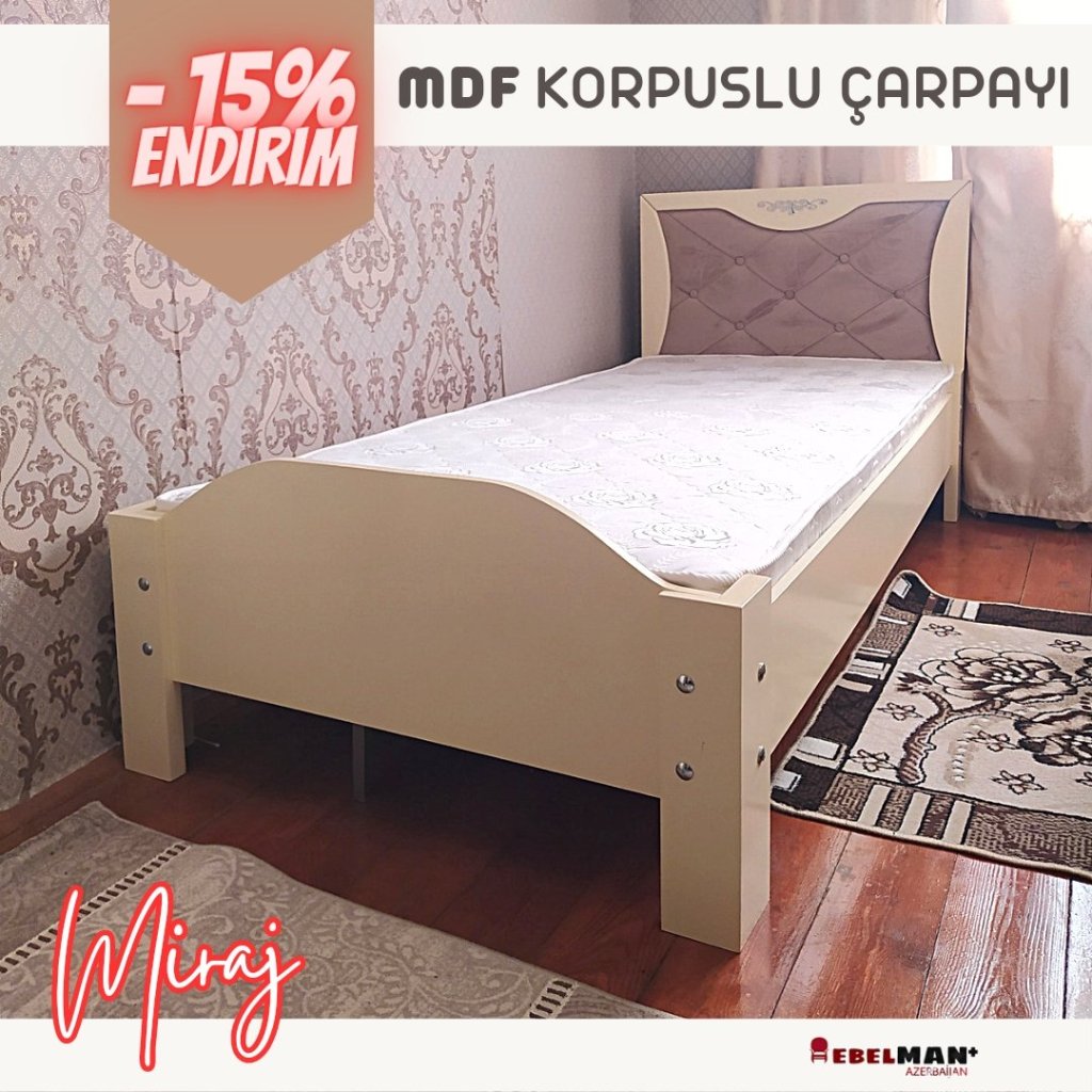 Miraj MDF tək adamlıq çarpayı, adından göründüyü kimi tamamilə MDF korpusa malikdir. Başlıq hissəsi yumuşaq materialla təchiz edilib, ayaq hissələri möhkəm və dayanıqlı bolt-qayka sistemi ilə bağlanıb. İstehsalında Türkiyə istehsalı MDF materialından, o cümlədən başlıq parça növü Türkiyə xammalıdır.