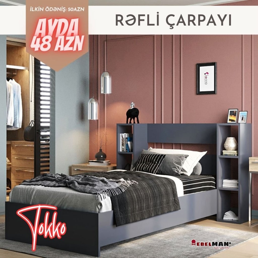 Fərqli dizaynda yeni məhsul TOKKO rəfli tək adamlıq çarpayılar, arzuladığınız rənglərdə sifarişlə. Cəmi 50₼ ilkin ödəniş ödəməklə ayda 48₼’a bu füsünkar mebeli əldə edə bilərsiniz.