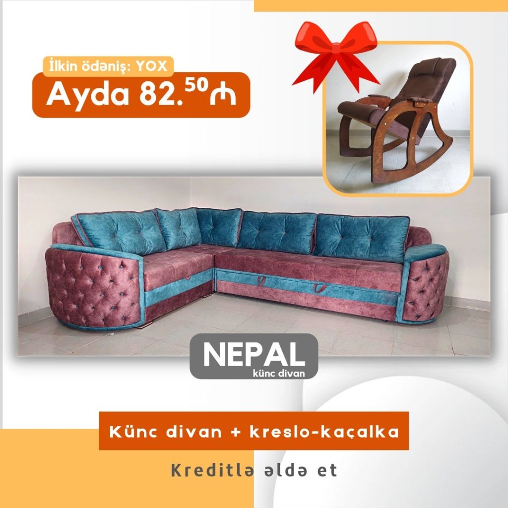 Yeni model künc divan NEPAL ilkin ödənişsiz 18 ayadək kreditlə ayda cəmi 83₼. Üstəlik yepyeni LİZA yellənən kreslo hədiyyə.