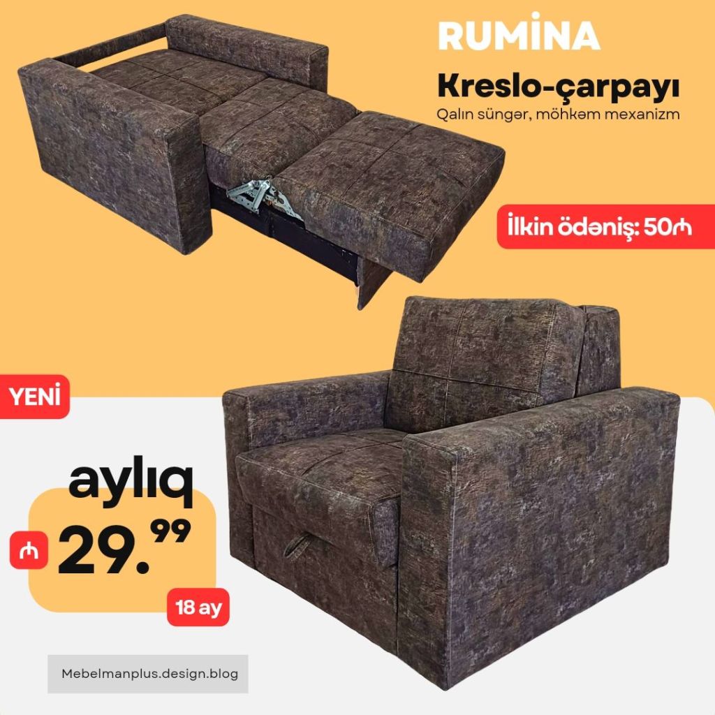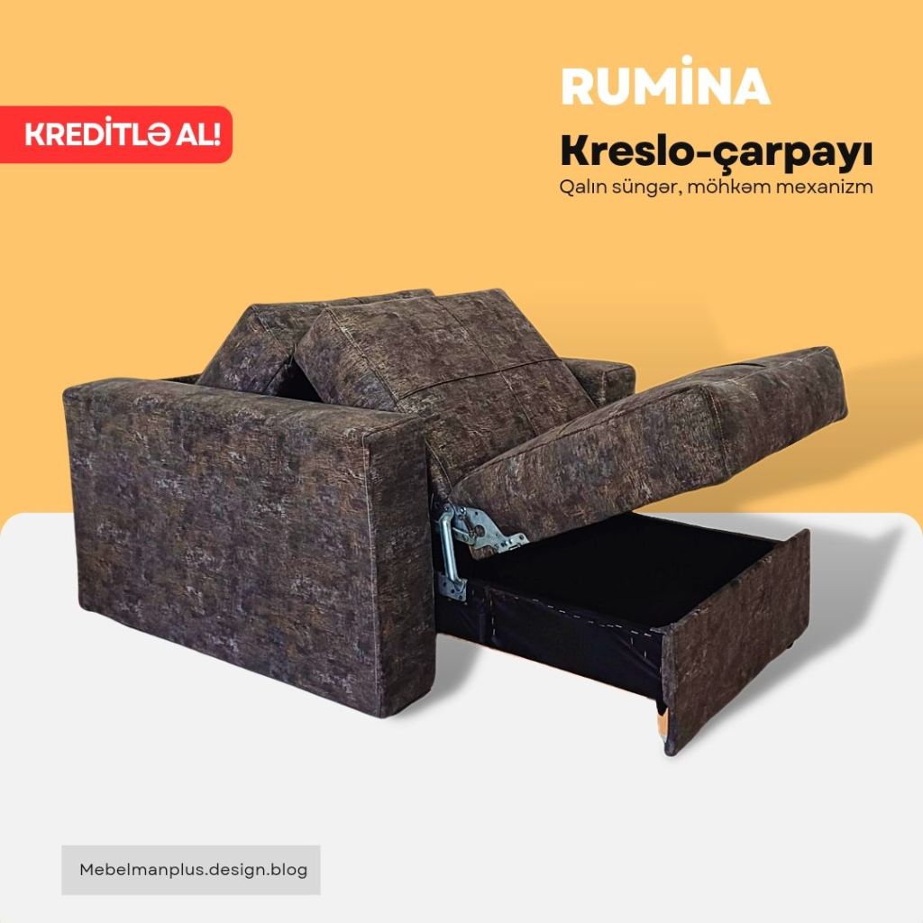 Sərfəli kredit şərtləri ilə RUMİNA amerikanka tipli kreslo-çarpayı modelini hər kəs ala biləcək. İstənilən rəng seçimi ilə sifariş edə biləcəyiniz bu məhsulun ideal keyfiyyətinə Zəmanət verilir.