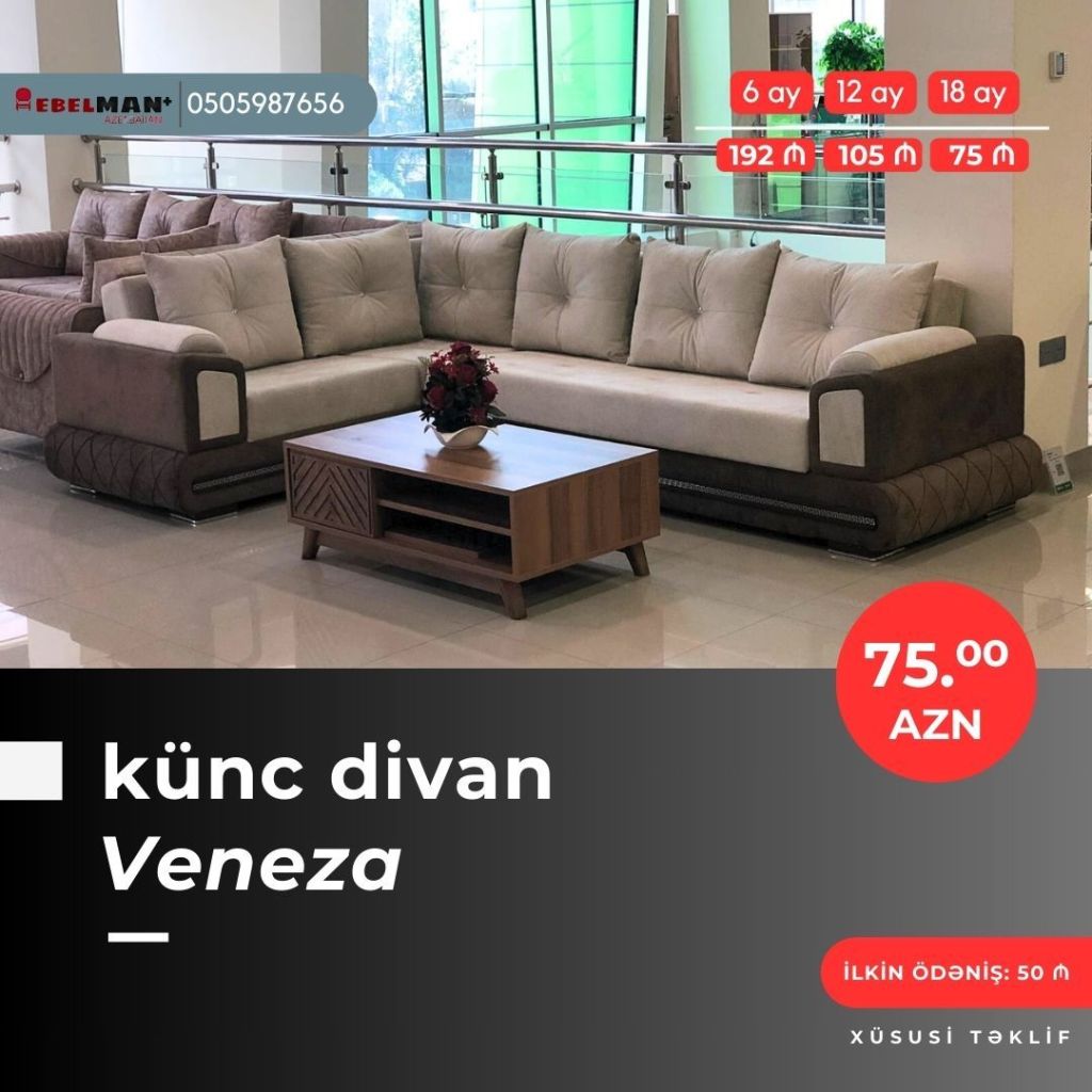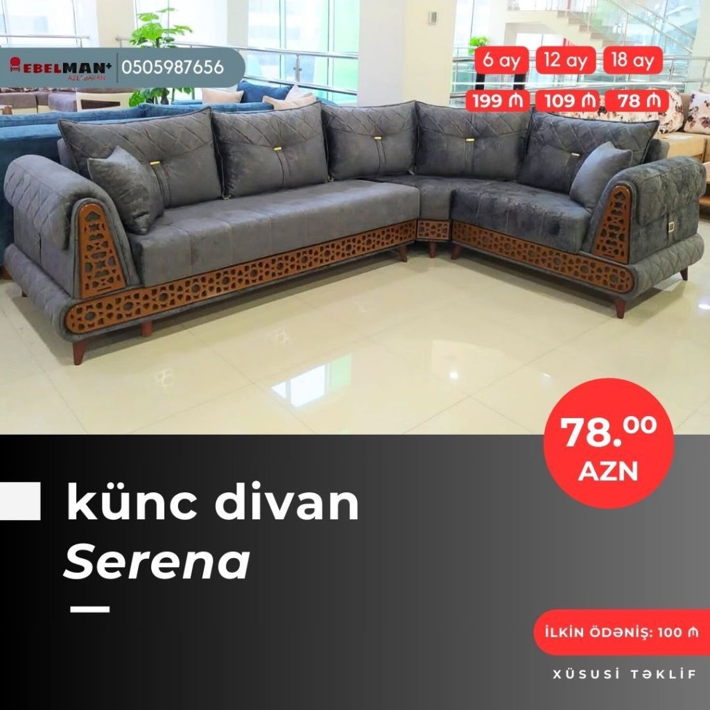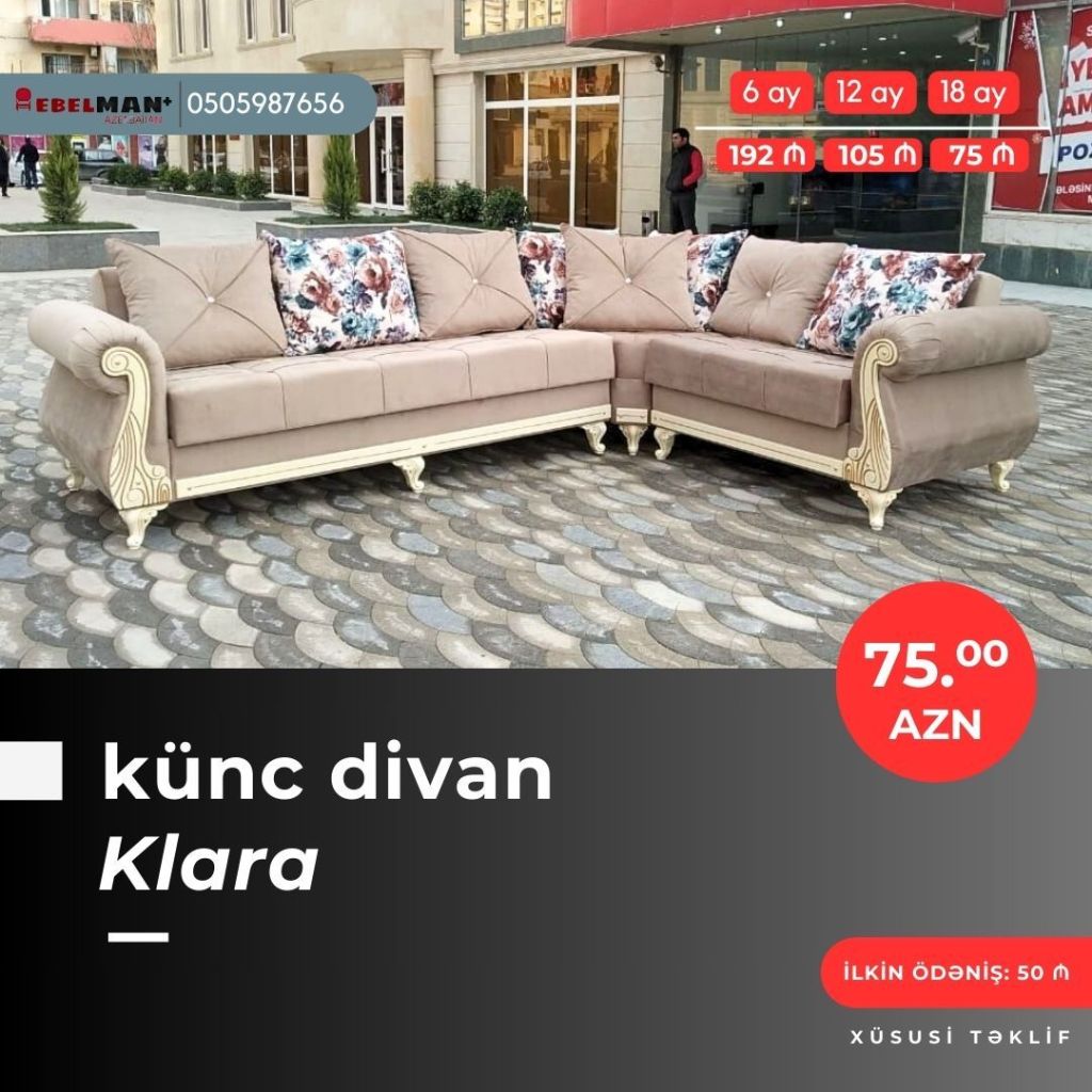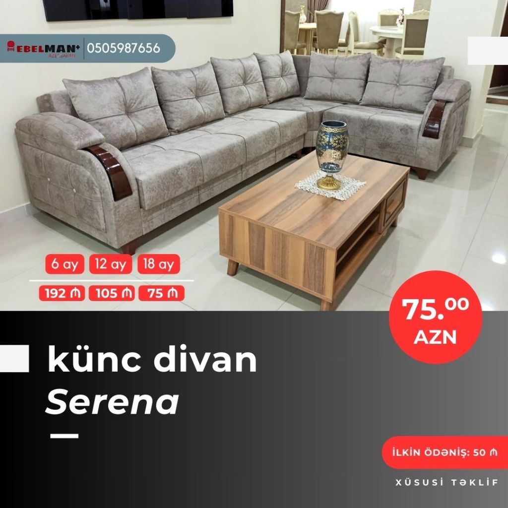 Əla fürsəti qaçırmayın! Yeni model künc divanlarını cəmi 50₼ ilkin ödəniş ödəməklə əldə edə bilərsiniz.